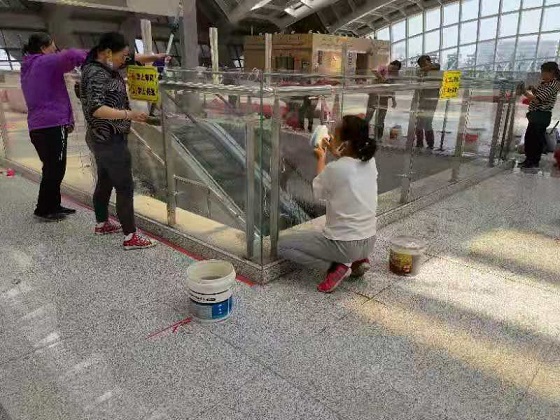 由于東客站長時(shí)間閑置導(dǎo)致站內(nèi)外車道、廣場(chǎng)雜草叢生,站內(nèi)通道、大廳地面及辦公區(qū)域灰塵堆積。由于啟用時(shí)間緊、作業(yè)面積較大,城發(fā)物業(yè)公司立即組織人員、機(jī)械設(shè)備、物料用品,次日一早,工作人員入場(chǎng)保潔,從門前車道、廣場(chǎng)除草、噴藥到建筑外立面玻璃擦拭;從站內(nèi)地面、辦公區(qū)域清潔到客車入站處場(chǎng)地及道路沖洗,隨處都能看到工作人員的身影。原本需要一周的工作,在工作人員的不懈努力下,僅用三天就完成了集團(tuán)公司安排的保潔工作任務(wù)。使保潔面積2.3萬平米的現(xiàn)場(chǎng)面貌煥然一新,具備了投入使用的條件,也體現(xiàn)了物業(yè)公司能打硬仗、敢于攻堅(jiān)的企業(yè)精神。