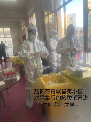 趙楓的工作是對核酸采集好的試管進行消毒處理然后清點,她所在小區(qū)居民大概900多人,每天的工作量不僅大,而且需要非常細心。剛開始的時候志愿者輪換崗位進行工作,由于其他志愿者不熟悉工作導致試管排序有誤,她主動提出來幫助清點,進過兩個小時的細心的盤點終于理清了,從此之后她就一直進行這項需要耐心和細心的工作。這也正是她對生活和工作的真實寫照,對生活她保持熱愛之心,積極向上;對工作一絲不茍,勇往直前,身上擔著的是責任,亦是榮幸。