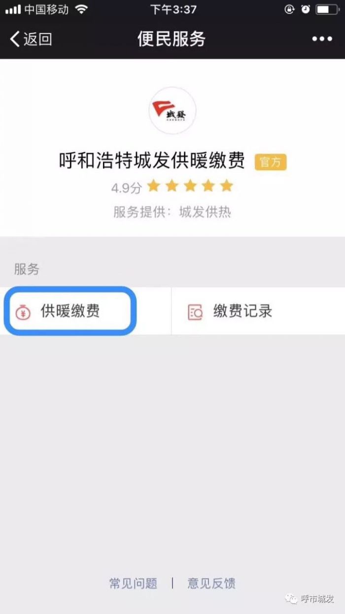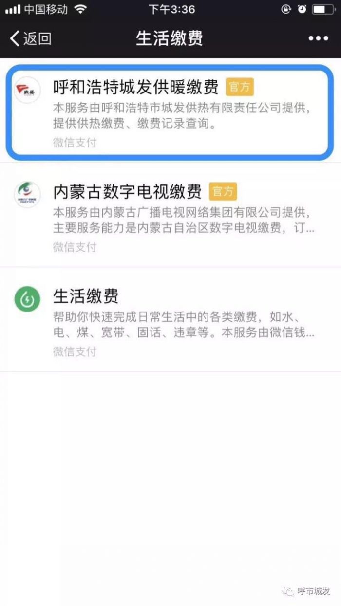 正確的微信繳費(fèi)流程:我-錢包-城市服務(wù)-便民服務(wù)(生活繳費(fèi))-呼和浩特城發(fā)供暖繳費(fèi)(官方)