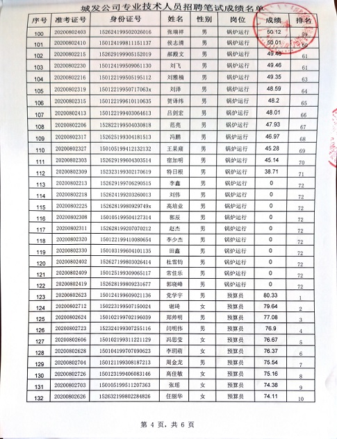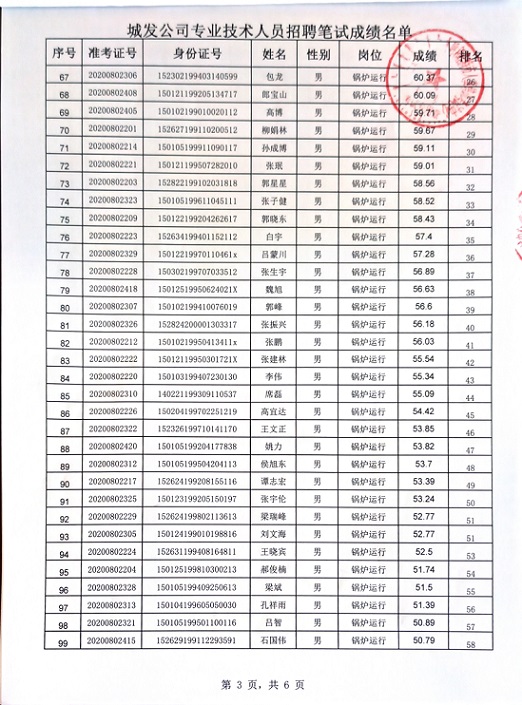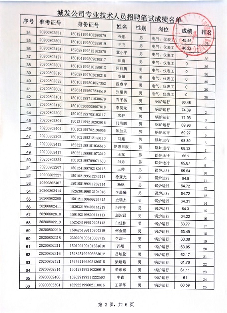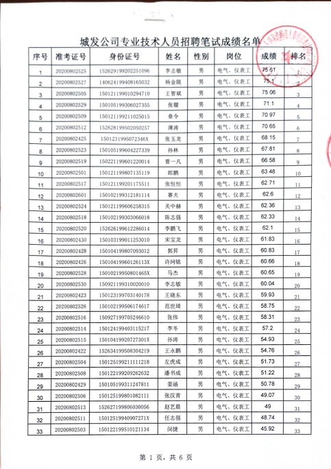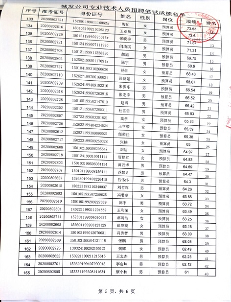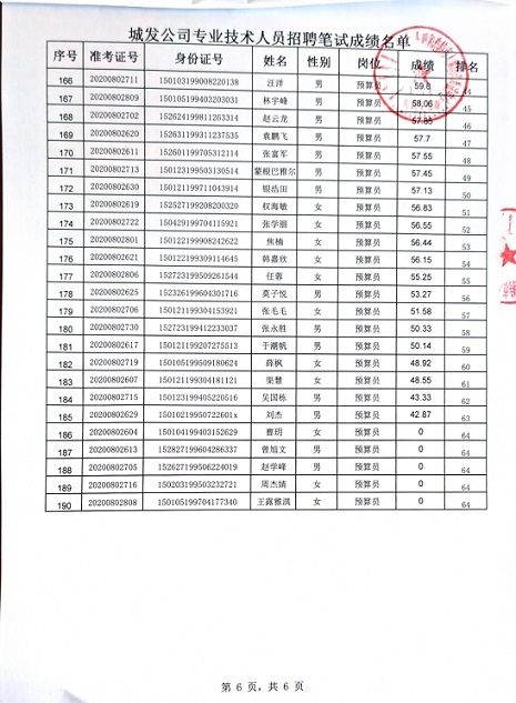 2020年城發(fā)公司專業(yè)技術(shù)人員招聘筆試成績名單